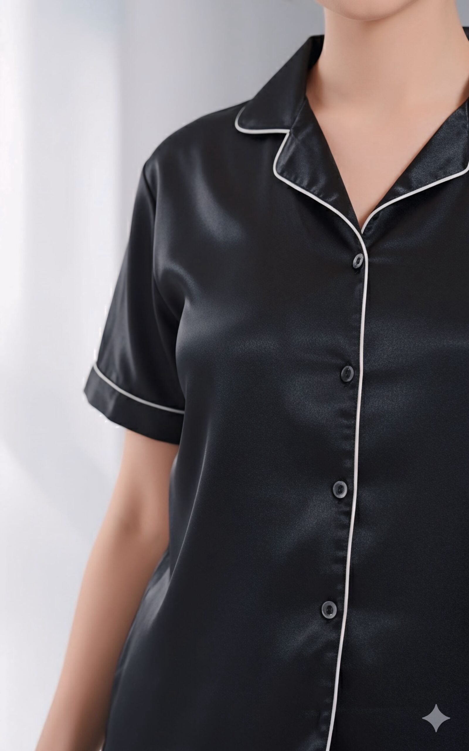 Introducing a women’s satin night suit set that redefines bedtime luxury. This set features a sleek short-sleeve button-up shirt, designed with a chic notched collar, and paired with matching shorts. Crafted from smooth and shiny satin fabric, its black shade and elegant white contrast piping exude sophistication and comfort. Whether you’re unwinding after a long day or enjoying a relaxed morning, this nightwear is the ultimate companion for a stylish yet cozy experience.